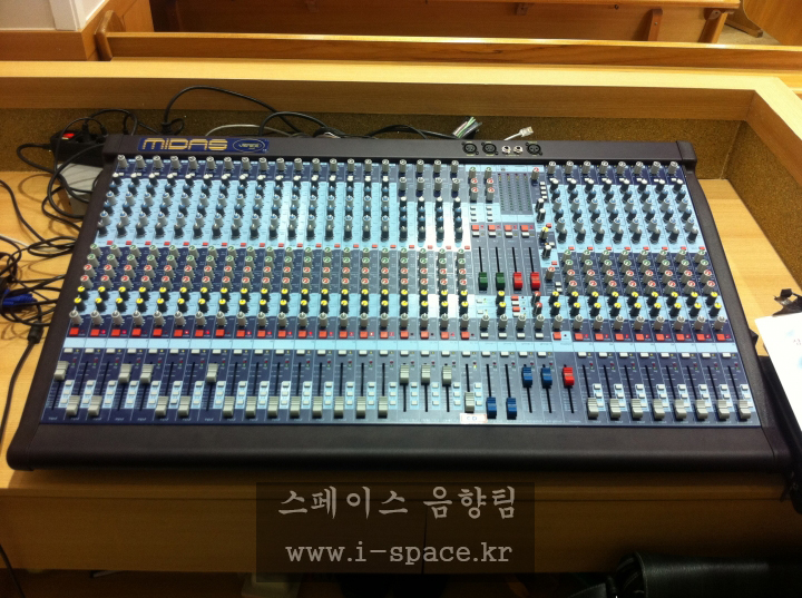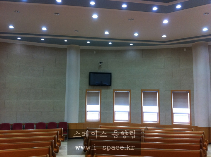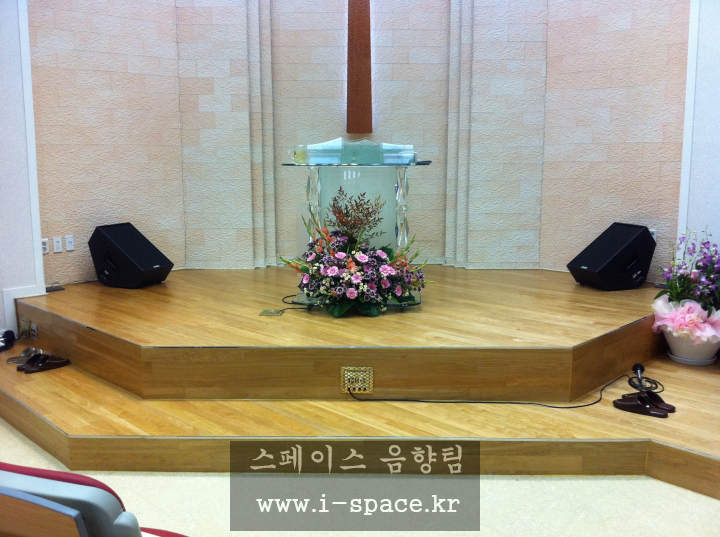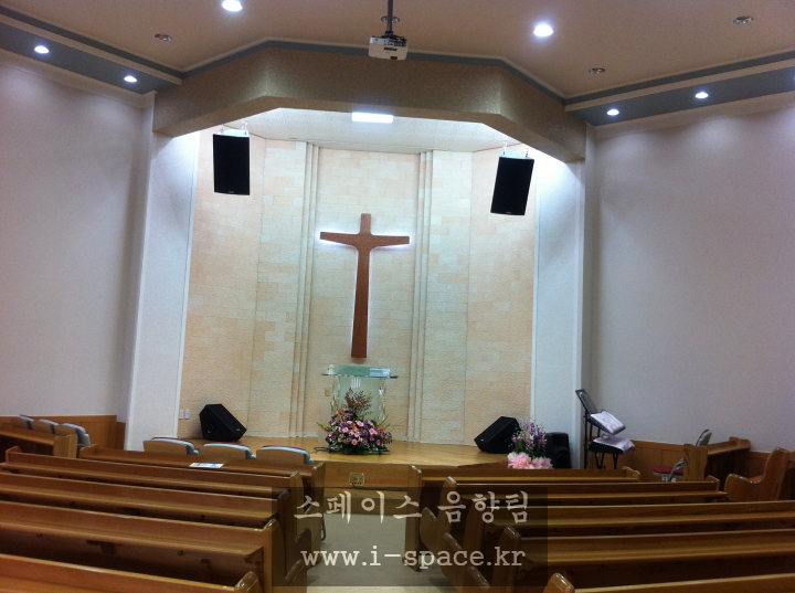 메인 콘솔 MG-16/6 CX 로 소리를 만들고 본당의 구조상 긴 복도식이라 플라잉되었던 스피커를 철거를 하고 양쪽벽에 브라켓을 사용 강단의 시아를 넓...