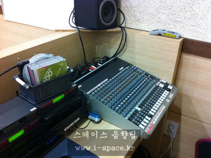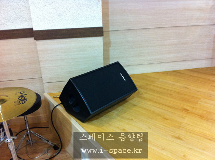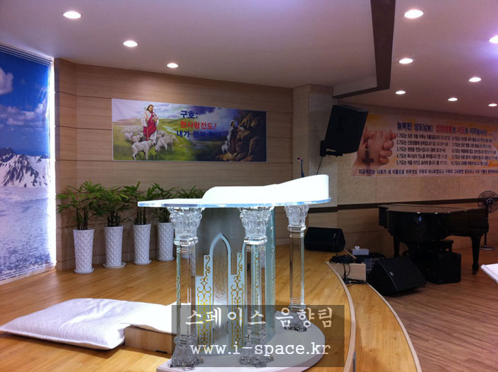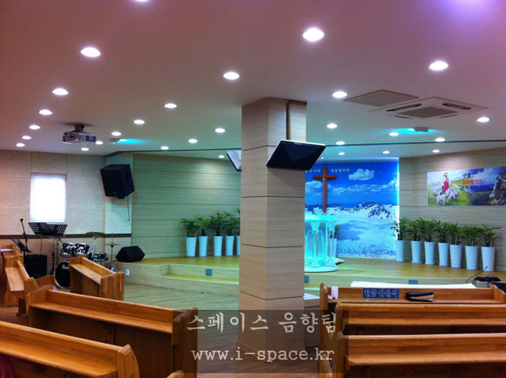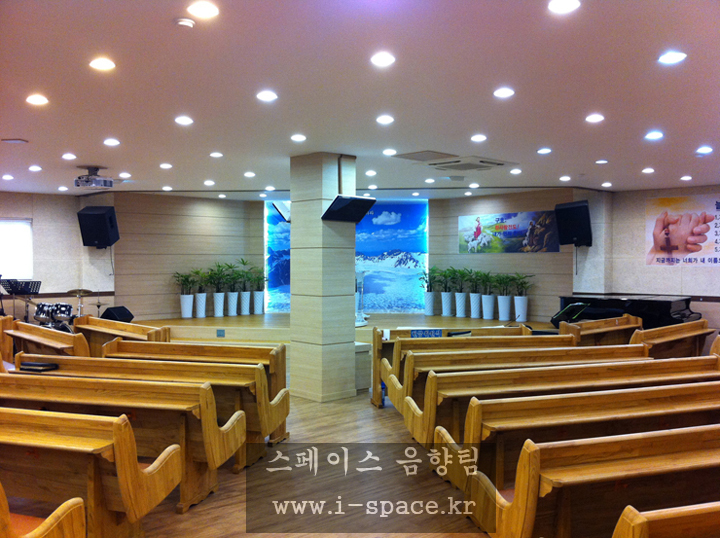 메인 콘솔 MG-16/6 CX 로 소리를 만들고 본당의 구조상 긴 복도식이라 플라잉되었던 스피커를 철거를 하고 양쪽벽에 브라켓을 사용 강단의 시아를 넓...