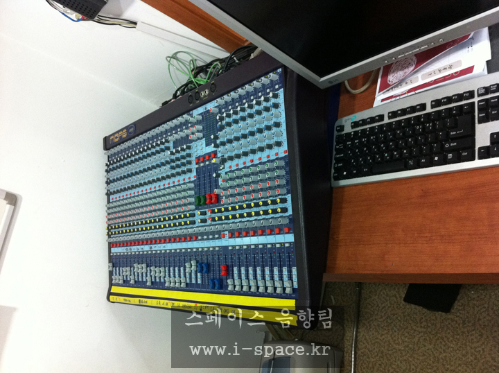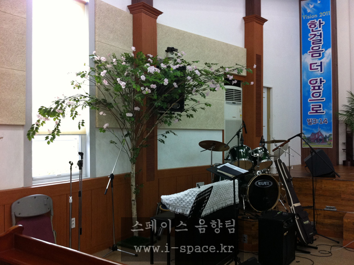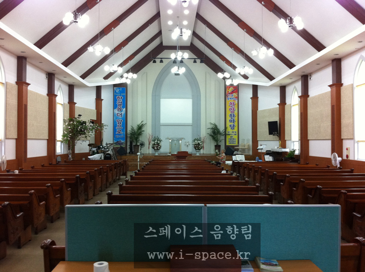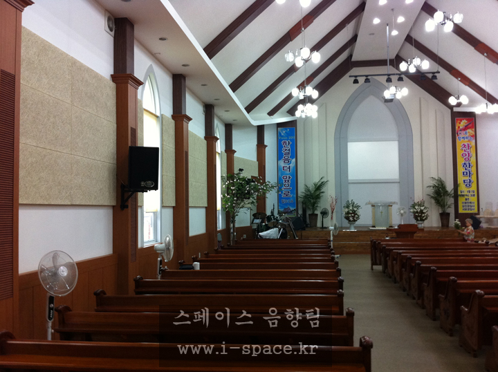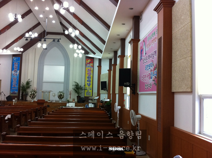 메인 콘솔 MG-16/6 CX 로 소리를 만들고 본당의 구조상 긴 복도식이라 플라잉되었던 스피커를 철거를 하고 양쪽벽에 브라켓을 사용 강단의 시아를 넓...