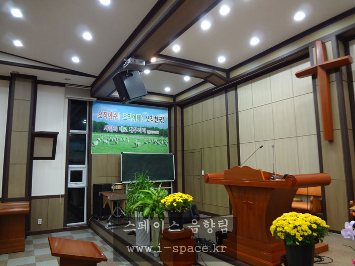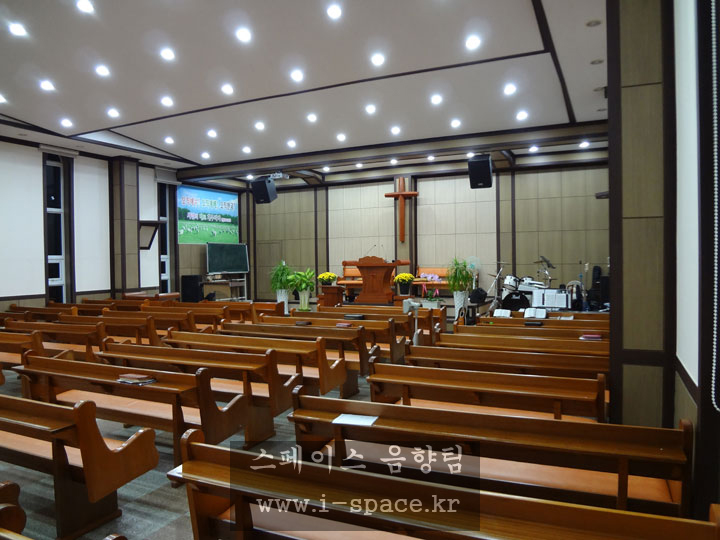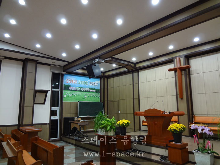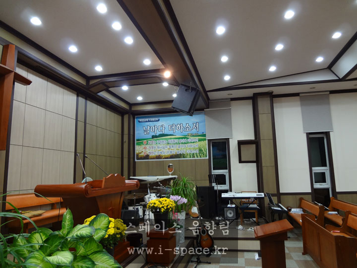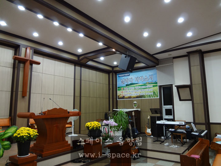 메인 콘솔 MG-16/6 CX 로 소리를 만들고 본당의 구조상 긴 복도식이라 플라잉되었던 스피커를 철거를 하고 양쪽벽에 브라켓을 사용 강단의 시아를 넓...