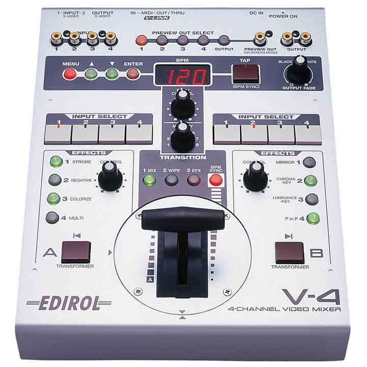 1) Video Mixer/ Switcher with 4CH Input V-4는 2개의 S-Video(Y/C) 입력과 4개의 Composite(RCA Pin)입력단자를 가지고 있으며, Dissolve, Wipes(200여가지), Switching 등의 효과를 사용하여 4채널의 Video Source에 대한 장면전환을 제공한다. 외부 분 배기를 사용하지 않고도 3개의 출력(Composite x2, S-videox1)으로 동일한 VideoSource를 출력한다.