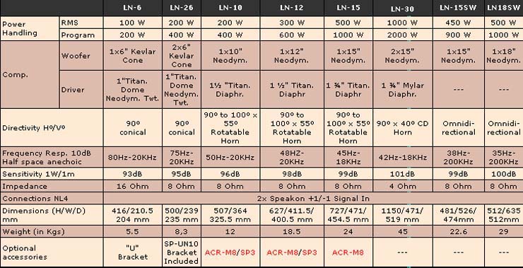 The LN-10 is a full range two-way system, with a trapezoidal-wedge shape for possible use in PA Systems or as an on-stage monitor. It comprises a Neodymium 10" Woofer and a 1" Driver with a 1 1/2" Titanium diaphragm. It incorporates an asymetrical dispersion horn which will optimise coverage either in horizontal or vertical position.