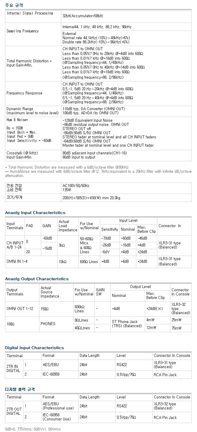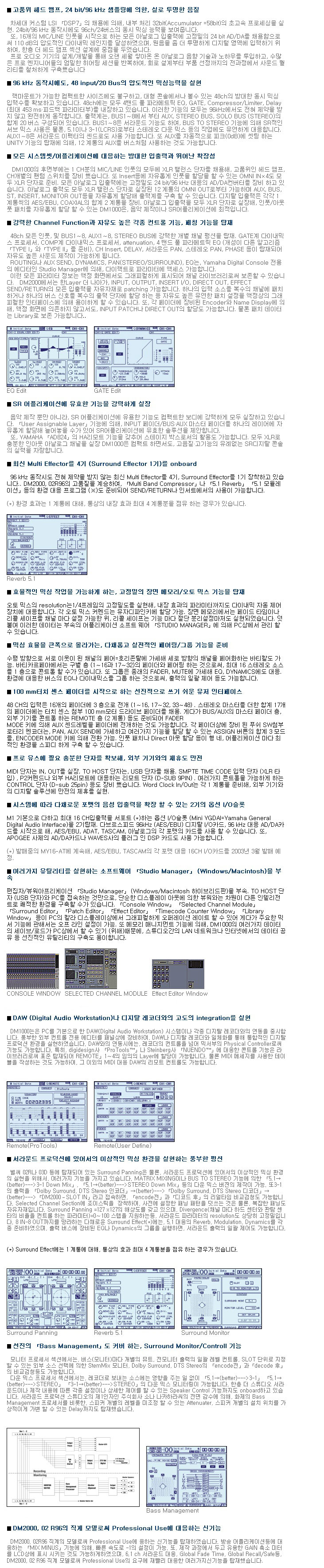 ■ 고품위 헤드 앰프, 양자화 24bit+96kHz 샘플링으로 실로 맑고 명쾌한 음질 ■ 96kHz 동작 시에도 48인풋/24버스의 압도적인 믹싱 용량 실현 ■ 다양한 시스템 설정/애플리케이션에 대응하는 풍부한 입출력과 뛰어난 확장성 ■ 강력한 채널 Function과 자유도가 매우 높은 각종 컨트롤 기능, 패칭 기능을 탑재 ■ SR 애플리케이션에 효과적인 기능을 강력하게 실현 ■ 최신의 멀티 이펙터 4기(서라운드 이펙트 1기)를 장착 ■ 효율적인 믹싱 작업을 가능하게 하는 고정밀의 장면 메모리/오토 믹스 기능을 탑재 ■ 믹싱 효율을 대폭적으로 향상시키는 다채롭고 실전적인 페어링/그룹 기능을 준비 ■ 100mm 터치 센스 페이더를 비롯한 선진적이며 사용하기 쉬운 사용자 인터페이스 ■ 프로용에 필요 충분한 단자를 확보하여 외부기기와의 연계에 만전을 기함 ■ 시스템에 따라 다채로운 포맷의 음성 입출력을 확장할 수 있는 2기의 옵션 I/O슬롯 ■ 여러 가지 유틸리티를 실현하는 소프트웨어 「Studio Manager」(Windows/Macintosh)부속 ■ DAW(Digital Audio Workstation)나 디지털 레코더와 고도의 통합을 실현 ■ 서라운드 프로덕션에 있어서의 이상적인 믹싱 환경을 실현하는 풍부한 기능 ■ 선진의 「Bass Management」를 커버하는 서라운드 모니터링 환경 컨트롤 기능 ■ DM2000, 02R96의 직계 형제 모델로서 프로용을 위한 신기능