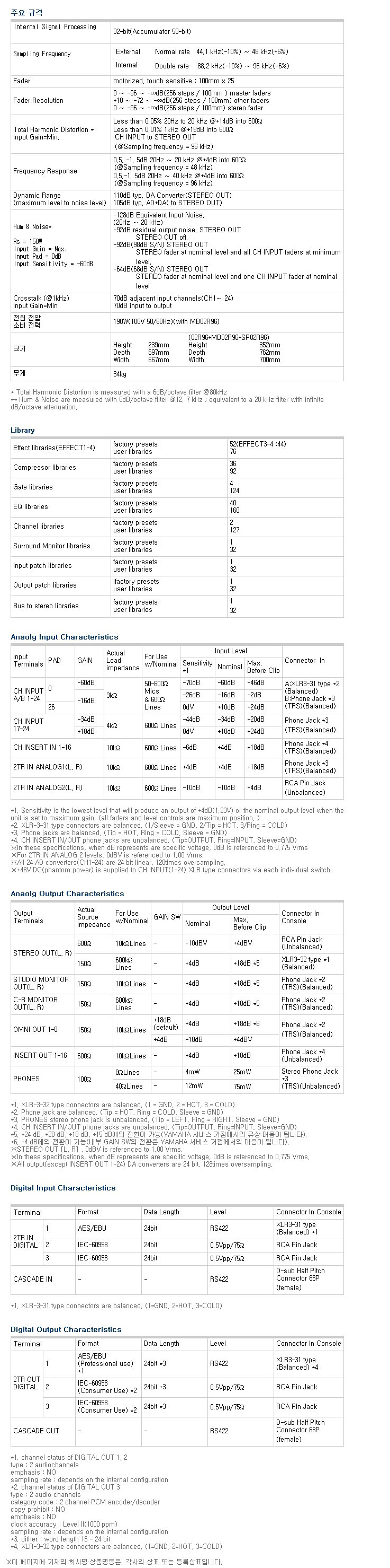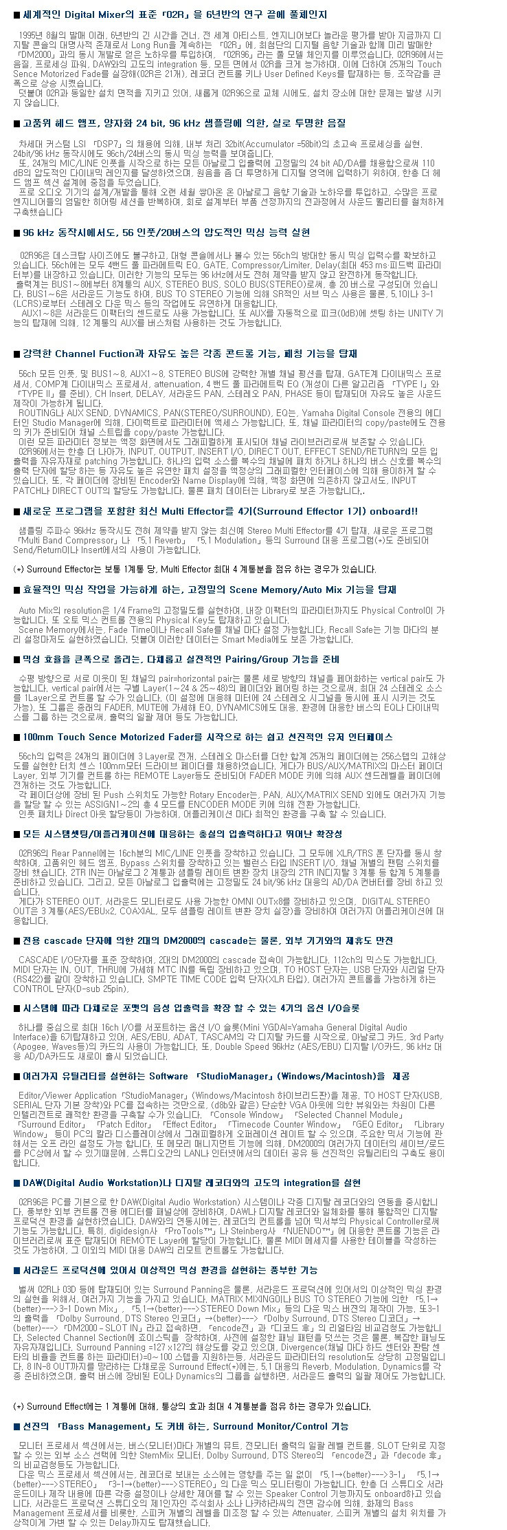 ■ 세계적인 디팩토 표준 모델「02R」이 6년 반 지나 풀 모델 체인지. ■ 고품위 헤드 앰프, 양자화 24bit, 96kHz 샘플링으로 실로 맑고 명쾌한 음질. ■ 96kHz 동작 시에도 56 인풋/20버스의 압도적인 믹싱 용량을 실현. ■ 강력한 채널 기능과 자유도가 높은 각종 컨트롤 기능, 패칭 기능 탑재. ■ 새로운 프로그램을 포함한 최신예 멀티 이펙터를 4기(서라운드 이펙트 1기) 탑재. ■ 효율적인 믹싱 작업을 가능하게 하는 고정밀의 씬 메모리/오토 믹스 기능을 탑재. ■ 믹싱 효율을 큰 폭으로 향상시키는 다채롭고 실전적인 페어링/그룹 기능을 준비. ■ 100mm 터치 센스 페이더를 비롯한 선진적이며 사용하기 쉬운 사용자 인터페이스. ■ 다양한 시스템 세팅/애플리케이션에 부응하는 풍부한 입출력과 뛰어난 확장성. ■ 전용 Cascade 단자로 2대의 02R96 Cascade는 물론 외부기기와의 연계에도 만전을 기함. ■ 시스템에 따라 다채로운 포맷의 음성 입출력을 확장할 수 있는 4기의 옵션 I/O슬롯. ■ 여러 가지 유틸리티를 실현하는 소프트웨어 「Studio Manager」(Windows/Macintosh)를 부속. ■ DAW(Digital Audio Workstation)나 디지털 레코더와 고도의 통합 실현. ■ 서라운드 프로덕션에 있어서 이상적인 믹싱 환경을 실현하는 풍부한 기능. ■ 선진의「Bass Management」를 커버하는 서라운드 모니터링 환경 컨트롤 기능.